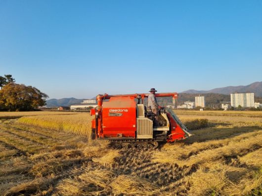 농민이 콤바인으로 벼를 수확하고 있다. 경주시 제공 |