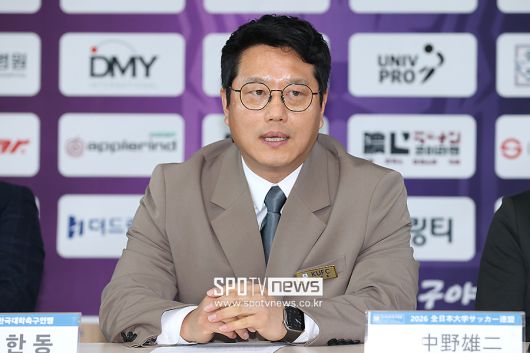 [스포티비뉴스=김천, 곽혜미 기자] 2026 한·일 대학축구연맹 덴소컵 협약식이 22일 오전 경상북도 김천시 종합스포츠타운 실내사격장에서 열렸다. 한국대학축구연맹 박한동 회장이 질문에 답하고 있다. <저작권자 ⓒ SPOTV NEWS. 무단전재 및 재배포 금지>