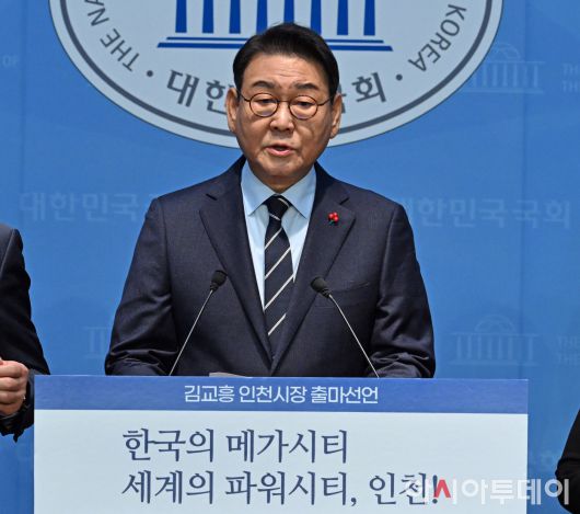 아시아투데이 송의주 기자 = 김교흥 더불어민주당 의원이 22일 국회 소통관에서 기자회견을 열고 인천시장 출마선언을 하고 있다.