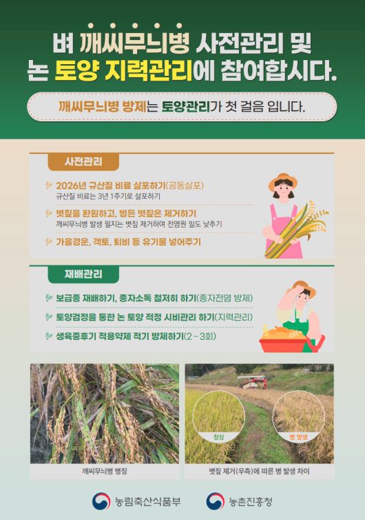농촌진흥청은 깨씨무늬병 방제 및 논 토양 지력 관리 방법을 안내문으로 제작, 전국 시군 농업기술센터에 배부했다.