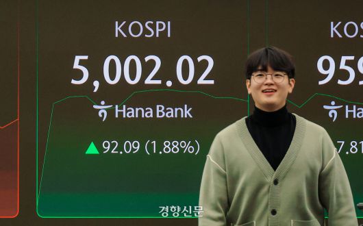 22일 서울 중구 하나은행 본점 딜링룸 현황판에 장 초반 5000포인트를 돌파한 코스피 지수가 표시되고 있다. 이준헌 기자 |
