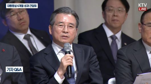 김용범 대통령실 정책실장이 7일 오후 용산 대통령실에서 열린 이재명 정부 출범 6개월 성과 언론 간담회에서 최근 고환율 문제와 관련한 대책을 설명하고 있다. [사진=KTV] |