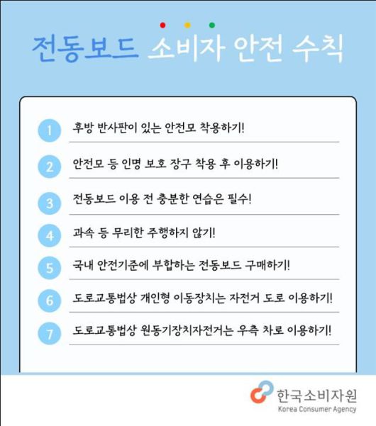 소비자원은 조사 결과를 바탕으로 관계 부처에 국내 안전기준 부합 여부 모니터링을 건의하고 소비자들에게 안전모 착용과 최대속도 이하로 주행할 것을 당부했다.