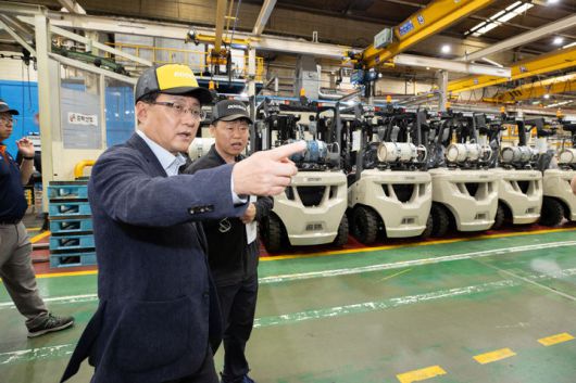 [서울=뉴시스] 김성환 환경부 장관이 28일 인천광역시 동구 소재 두산밥캣코리아 생산 공장을 방문하여 전기 지게차 생산과정을 살펴보고 있다. (사진=환경부 제공) 2025.08.28. photo@newsis.com *재판매 및 DB 금지 |