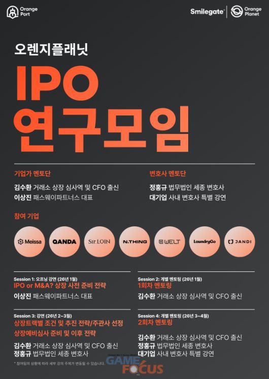 스마일게이트 오렌지플래닛 창업재단(이하 오렌지플래닛, 센터장 서상봉)이 기업가치 1000억 원 이상 단계에 진입해 기업공개(IPO)를 검토하는 스타트업을 대상으로 ‘IPO 연구모임’을 운영한다고 22일 밝혔다.