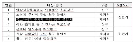 복지부와 심평원은 의약계가 참여한 '자율점검운영협의체' 논의를 거쳐 일상생활동작검사 인정횟수 초과청구, 조영제 주사제 구입·청구 불일치, 국소마취제 주사제 구입·청구 불일치 등 점검 대상 7개 항목을 선정했다. 1월부터 순차적으로 이들 항목에 대해 부당 청구 개연성이 높은 병원·의원·약국을 자율점검 대상 기관으로 통보한다.