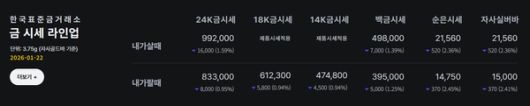 [스타데일리뉴스=서태양기자] 한국표준금거래소 1월 22일 기준 24K 금시세는 내가 살 때 3.75g당 992,000원으로, 전일 대비 16,000원(-1.59%) 하락했다.