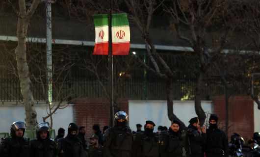 지난 14일(현지시간) 이란 테헤란 영국대사관 앞에서 이란 경찰들이 시위하는 학생들을 경계하고 있다.[EPA] |