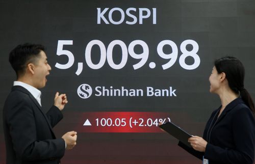 장중 사상 첫 5,000선 돌파한 코스피 (서울=연합뉴스) 코스피가 장중 5,000을 넘어선 가운데 22일 서울 중구 신한은행 본점 로비에서 딜러들이 미소 짓고 있다. 2026.1.22 [신한투자증권 제공. 재판매 및 DB 금지] photo@yna.co.kr (끝) <저작권자(c) 연합뉴스, 무단 전재-재배포, AI 학습 및 활용 금지> |
