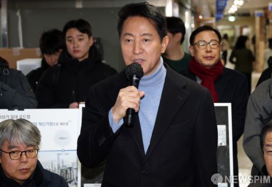 [서울=뉴스핌] 정일구 기자 = 용산전자상가 현장 점검에 나선 오세훈 서울시장이 22일 오전 서울 용산구 선인상가에서 열린 상가 소유자·상인·지역주민 현장 간담회에서 발언을 하고 있다. 2026.01.22 mironj19@newspim.com