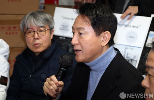 [서울=뉴스핌] 정일구 기자 = 용산전자상가 현장 점검에 나선 오세훈 서울시장이 22일 오전 서울 용산구 선인상가에서 열린 상가 소유자·상인·지역주민 현장 간담회에서 발언을 하고 있다. 2026.01.22 mironj19@newspim.com