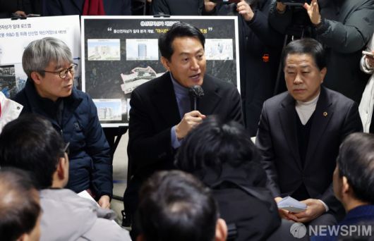 [서울=뉴스핌] 정일구 기자 = 용산전자상가 현장 점검에 나선 오세훈 서울시장이 22일 오전 서울 용산구 선인상가에서 열린 상가 소유자·상인·지역주민 현장 간담회에서 발언을 하고 있다. 2026.01.22 mironj19@newspim.com
