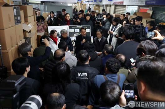[서울=뉴스핌] 정일구 기자 = 용산전자상가 현장 점검에 나선 오세훈 서울시장이 22일 오전 서울 용산구 선인상가에서 열린 상가 소유자·상인·지역주민 현장 간담회에서 발언을 하고 있다. 2026.01.22 mironj19@newspim.com