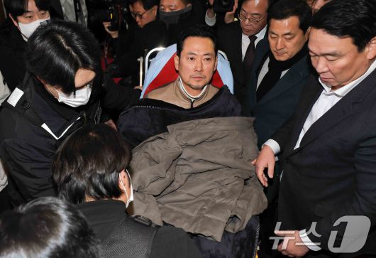 (서울=뉴스1) 국회사진기자단 = 8일 만에 단식 중단을 선언한 장동혁 국민의힘 대표가 22일 서울 여의도 국회에서 병원으로 이송되고 있다. 2026.1.22/뉴스1