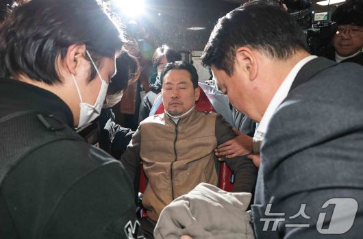 (서울=뉴스1) 국회사진기자단 = 8일 만에 단식 중단을 선언한 장동혁 국민의힘 대표가 22일 서울 여의도 국회에서 병원으로 이송되고 있다. 2026.1.22/뉴스1