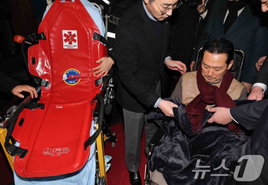 (서울=뉴스1) 국회사진기자단 = 8일 만에 단식 중단을 선언한 장동혁 국민의힘 대표가 22일 서울 여의도 국회에서 병원으로 이송되고 있다. 2026.1.22/뉴스1