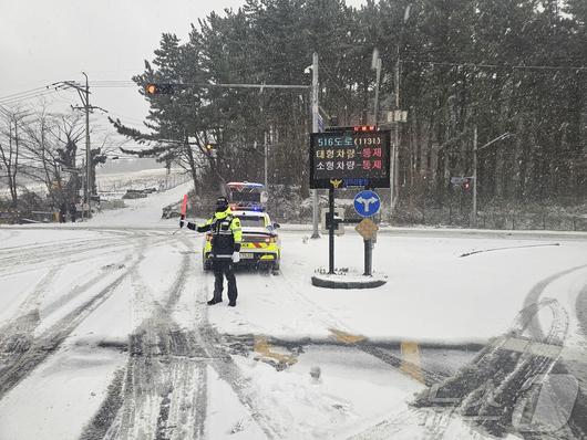 (제주=뉴스1) 홍수영 기자 = 22일 제주도 중산간 이상 지역에 대설주의보가 발효 중인 가운데 제주경찰이 5.16도로 운행을 통제하는 모습.(제주경찰청 제공. 재판매 및 DB 금지) 2026.1.22/뉴스1gwin@news1.krCopyright ⓒ 뉴스1. All rights reserved. 무단 전재 및 재배포, AI학습 이용 금지.