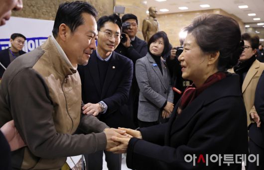 아시아투데이 이병화 기자 = 박근혜 전 대통령이 22일 쌍특검(통일교·민주당 공천 뇌물 특검)을 요구하며 8일째 단식을 이어가는 장동혁 국민의힘 대표의 단식 농성장을 방문해 인사를 나누고 있다.
