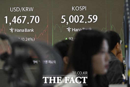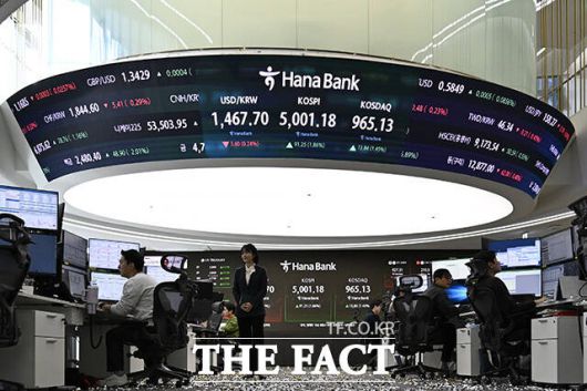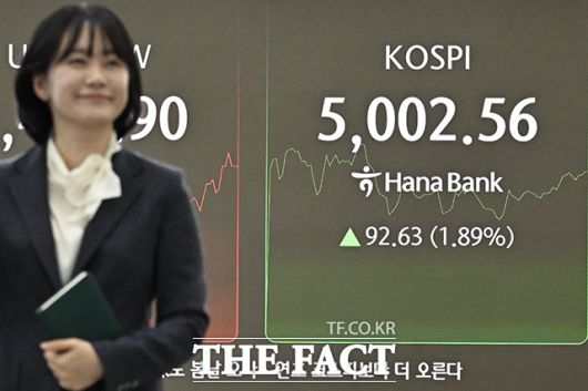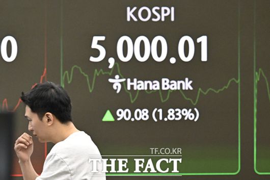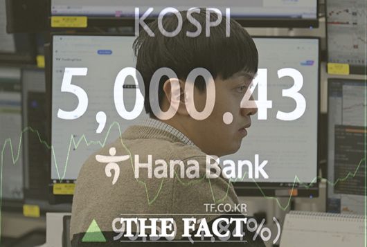 [더팩트 | 송호영 기자] 코스피가 사상 최초로 장중 5000선을 돌파한 22일 오전 서울 서울 중구 하나은행 본점 딜링룸 전광판에 지수가 표시되고 있다.