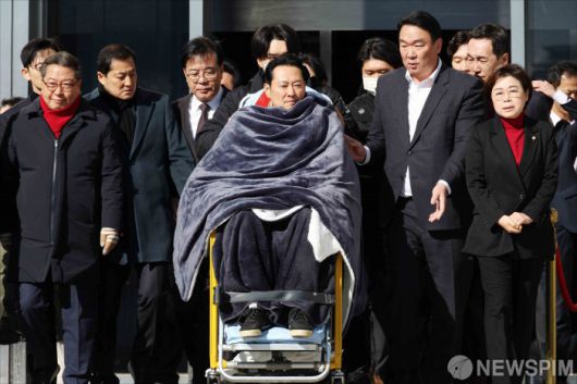 [서울=뉴스핌] 윤창빈 기자 = 통일교·공천헌금 '쌍특검'을 요구하며 8일째 단식을 진행 중인 장동혁 국민의힘 대표가 22일 서울 여의도 국회에서 단식을 중단하고 병원으로 이송되고 있다. 2026.01.22 pangbin@newspim.com