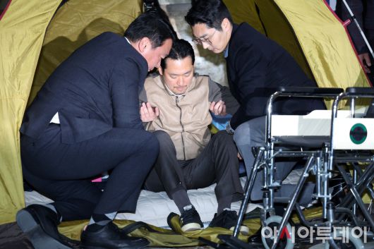 아시아투데이 송의주 기자 = 통일교·공천헌금 '쌍특검'을 요구하며 8일째 단식을 진행 중인 장동혁 국민의힘 대표가 22일 서울 여의도 국회에서 단식을 중단하고 병원으로 이송되고 있다.