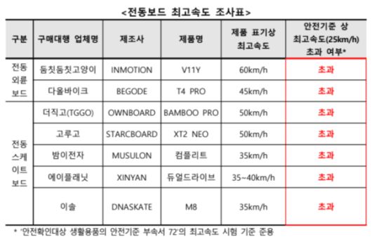 최고속도 25km/h 기준 무색… 조사 제품 전량 부적합