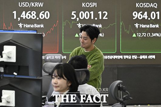 [더팩트 | 송호영 기자] 코스피가 사상 최초로 장중 5000선을 돌파한 22일 오전 서울 서울 중구 하나은행 본점 딜링룸 전광판에 지수가 표시되고 있다.
