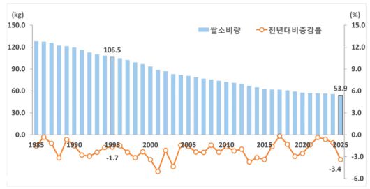 쌀 소비는 지속적으로 줄고 있다. 1995년 소비량인 106.5㎏과 비교하면 양곡 전체 감소 흐름과 비슷한 절반 수준이다. 1962년 관련 통계 작성 이후 역대 최소치다.