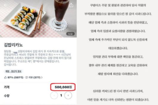 앞서 지난 20일 사회관계망서비스(SNS) 상에선 ‘김밥리카노(김밥 1줄+라지 커피 1잔)’ 메뉴 가격이 50만 원으로 책정되어 있는 사진이 관심을 받았다.
