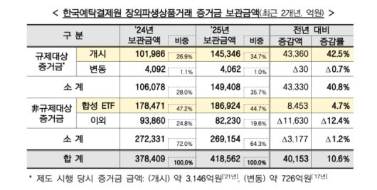 규제 대상 증거금은 전량 국내채권으로 보관됐으며, 국채(13조 9740억 원·93.5%)과 통화안정증권(9668억 원·6.5%)으로 구성됐다. 비규제 담보에서는 국내주식 비중(56.9%)이 국내채권(39.8%)을 웃돌았고, 원화 현금(3.3%)도 일부 포함된 것으로 나타났다.