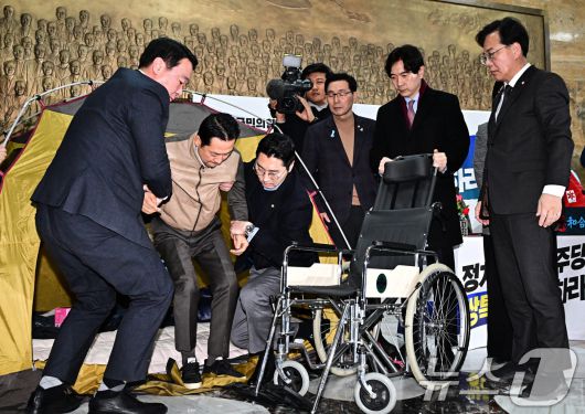 (서울=뉴스1) 국회사진기자단 = '통일교·공천헌금' 쌍특검법 수용을 촉구하며 8일째 단식을 이어오던 장동혁 국민의힘 대표가 22일 서울 여의도 국회 로텐더홀에서 단식 중단을 선언한 뒤 휠체어에 오르고 있다. 2026.1.22/뉴스1