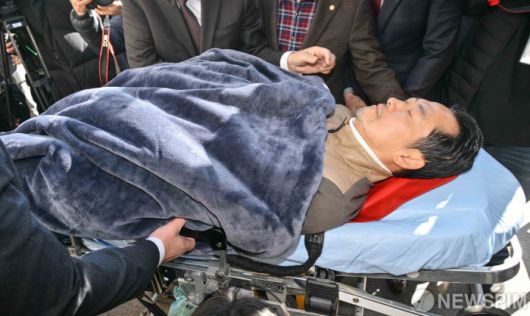 [서울=뉴스핌] 윤창빈 기자 = 통일교·공천헌금 '쌍특검'을 요구하며 8일째 단식을 진행 중인 장동혁 국민의힘 대표가 22일 서울 여의도 국회에서 단식을 중단하고 병원으로 이송되고 있다. 2026.01.22 pangbin@newspim.com