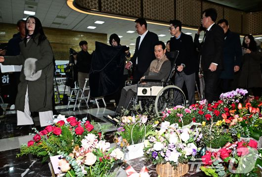(서울=뉴스1) 국회사진기자단 = '통일교·공천헌금' 쌍특검법 수용을 촉구하며 8일째 단식을 이어오던 장동혁 국민의힘 대표가 22일 서울 여의도 국회 로텐더홀에서 단식 중단을 선언한 뒤 병원으로 향하고 있다. 2026.1.22/뉴스1photolee@news1.krCopyright ⓒ 뉴스1. All rights reserved. 무단 전재 및 재배포, AI학습 이용 금지.