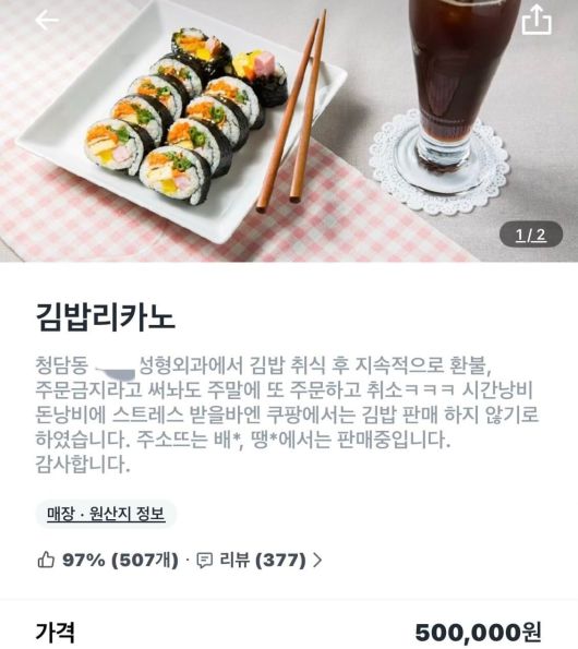 앞서 강남구에서 한 카페를 운영하는 자영업자는 최근 쿠팡이츠에 메뉴 ‘김밥리카노(김밥 1줄+라지 사이즈 커피)’의 가격을 50만원에 올려뒀다. 그러면서 메뉴 설명란에 “청담동 OO 성형외과 주문 금지”라며 “해당 성형외과에서 김밥 취식 후 지속적으로 환불, 취소를 반복해 주소가 뜨지 않는 플랫폼에서는 김밥을 아예 판매하지 않기로 했다”고 적었다.