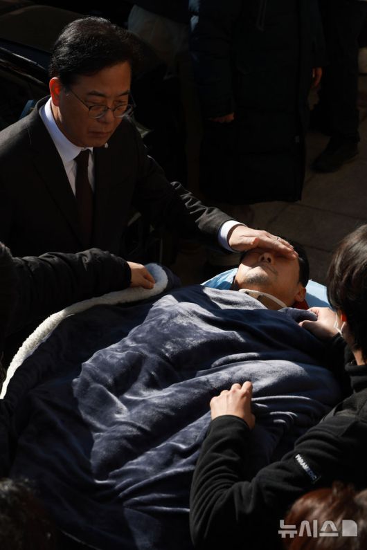 [서울=뉴시스] 고승민 기자 = 여드레째 단식농성을 이어 온 장동혁 국민의힘 대표가 22일 서울 여의도 국회에서 병원으로 이송되고 있다. 송언석 원내대표 등이 햇빛을 가려주고 있다. 2026.01.22. kkssmm99@newsis.com