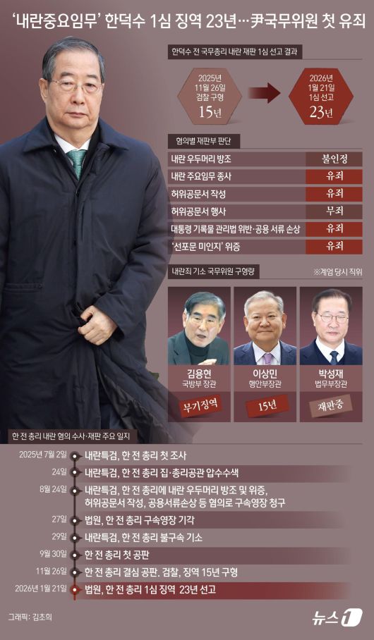 한덕수 전 국무총리가 ‘계엄의 절차적 정당성 확보를 목적으로 국무회의 소집을 건의했다’는 내란중요임무종사 혐의로 1심에서 징역 23년의 중형을 선고받으면서, 같은 혐의로 재판을 받고 있는 다른 국무위원들에도 영향이 수 있다는 전망이 나온다.