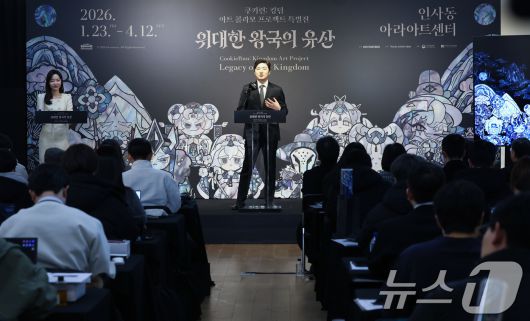 (서울=뉴스1) 최지환 기자 = 조길현 데브시스터즈 대표가 22일 서울 종로구 아라아트센터에서 열린 '쿠키런: 킹덤 아트 콜라보 프로젝트 특별전 - 위대한 왕국의 유산' 언론공개회에서 발언하고 있다. 이번 특별전은 데브시스터즈가 지난 2년간 이어 온 아트 콜라보 프로젝트를 총망라한 전시로 오는 23일부터 4월 12일까지 개최된다. 2026.1.22/뉴스1