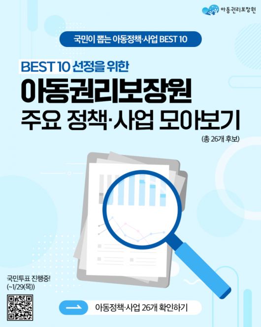 아동권리보장원은 오는 29일까지 아동권리보장원 출범 7년 차를 맞아 아동복지 정책에 대한 국민적 관심을 높이고 정책 사업 추진에 국민 의견을 반영하기 위해 '국민이 선택한 아동 정책·사업 베스트 10' 대국민 온라인 투표를 진행한다고 22일 밝혔다.