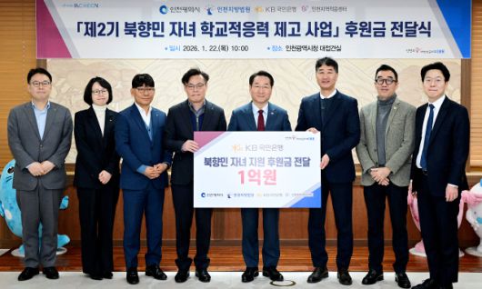 인천시는 22일 ‘북향민 자녀 학교적응력 제고 제2기 사업’ 추진을 위한 후원금 전달식을 열고 국민은행에서 1억 원을 전달받았다. 이날 행사에는 유정복 인천시장, 김영일 국민은행 기관영업그룹대표, 박철성 인천지역적응센터장 등이 참석했다.