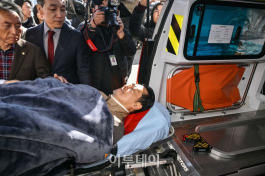 통일교·공천헌금 '쌍특검' 수용을 요구하며 단식 8일째를 맞은 장동혁 국민의힘 대표가 22일 서울 여의도 국회에서 단식 중단을 선언한 뒤 병원으로 이송되고 있다. 고이란 기자 photoeran@ |