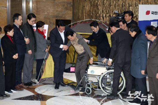통일교·공천헌금 '쌍특검'을 요구하며 8일째 단식을 이어가던 장동혁 국민의힘 대표가 22일 서울 여의도 국회에서 단식을 중단하며 농성 텐트 밖으로 나서고 있다.