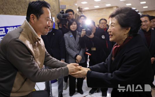 [서울=뉴시스] 김명년 기자 = 박근혜 전 대통령이 22일 서울 여의도 국회 로텐더홀 에서 통일교·공천헌금 '쌍특검' 수용을 촉구하며 단식농성중인 장동혁 국민의힘 대표를 찾아 손을 잡고 있다.(공동취재) 2026.01.22. photo@newsis.com