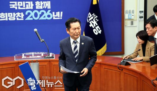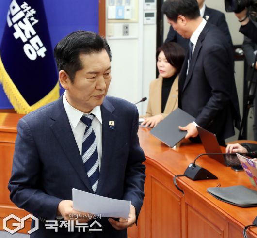 (서울=국제뉴스) 정청래 더불어민주당 대표가 22일 오전 서울 여의도 국회에서 조국혁신당과의 합당을 제안하는 긴급기자회견을 마친 후 이동하고 있다./사진=이용우 기자