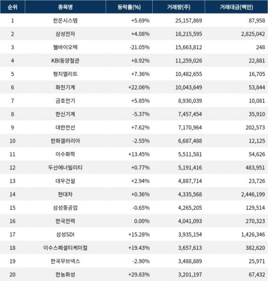한편 거래량 상위 20위권 종목들은 이수화학(005950) ▲13.45%, 두산에너빌리티(034020) ▲0.77%, 대우건설(047040) ▲2.94%, 현대차(005380) ▲0.36%, 삼성중공업(010140) ▼0.65%, 한국전력(015760) 보합, 삼성SDI(006400) ▲15.28%, 이수스페셜티케미컬(457190) ▲19.43%, 한국무브넥스(010100) ▼2.90%, 한농화성(011500) ▲29.83% 등의 성적을 기록하고 있다.