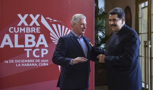 미겔 디아스카넬 쿠바 대통령(왼쪽)이 지난 2021년 12월 14일 쿠바 아바나에서 열린 '미주대륙을 위한 볼리바르 동맹(ALBA)' 정상회담에 참석한 니콜라스 마두로 베네수엘라 대통령과 인사하고 있다.AP뉴시스