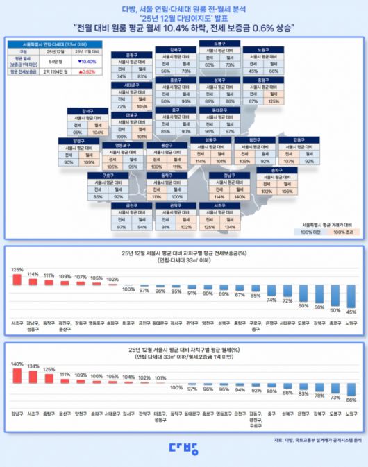 22일 다방이 발표한 '12월 다방여지도'에 따르면 서울 연립·다세대 원룸(전용 33㎡ 이하) 기준 평균 월세는 64만원(보증금 1000만원 시), 평균 전세 보증금은 2억1194만원으로 각각 집계됐다.