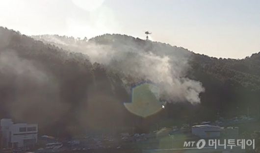 부산 기장군 기장은 청강리 산7419의 일원에서 발생한 산불이 이틀째 이어진 22일 소방 헬기가 공중에서 진화 작업을 벌이고 있다. /사진=뉴시 |