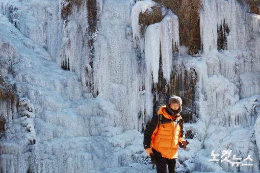체감 온도가 영하 20도를 안팎까지 떨어지는 등 한파가 절정을 보인 22일 서울 서대문구 홍제폭포가 얼어붙어 있다.