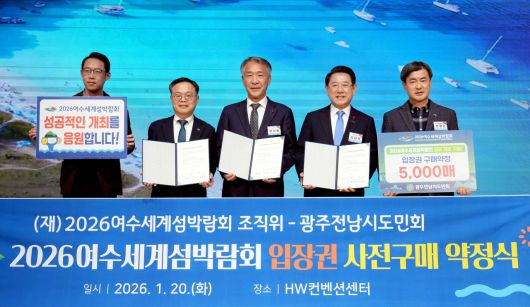 [헤럴드경제(여수)=신건호 기자] (재)2026여수세계섬박람회조직위원회가 서울 종로구 HW컨벤션센터에서 광주전남시도민회와 ‘2026여수세계섬박람회 입장권 5,000매 구매약정’을 체결했다.