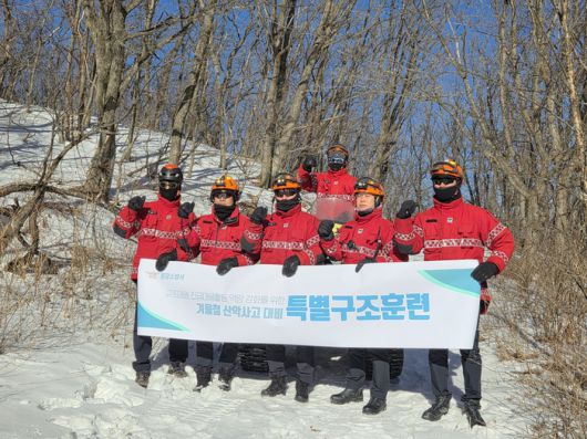 구조대원들은 급경사 지형과 적설 구간을 활용해 부상자 안전 이송, 로프를 이용한 인명구조, 설상 운반 장비 조작 등 다양한 상황별 대응훈련을 실시하며 현장 실전 감각을 끌어올렸다.
